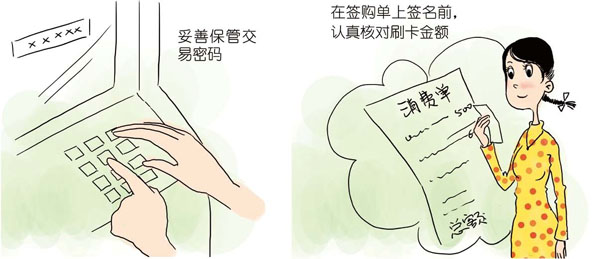 4.在签购单上签名前,认真核对刷卡金额。不要随意丢弃有个人信息的书面材料或刷卡单据。